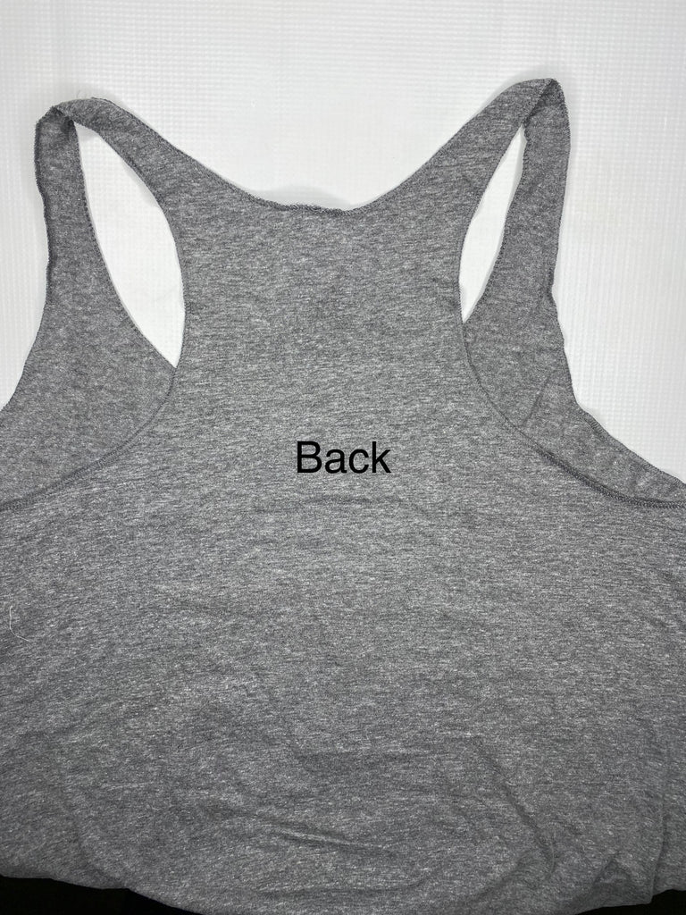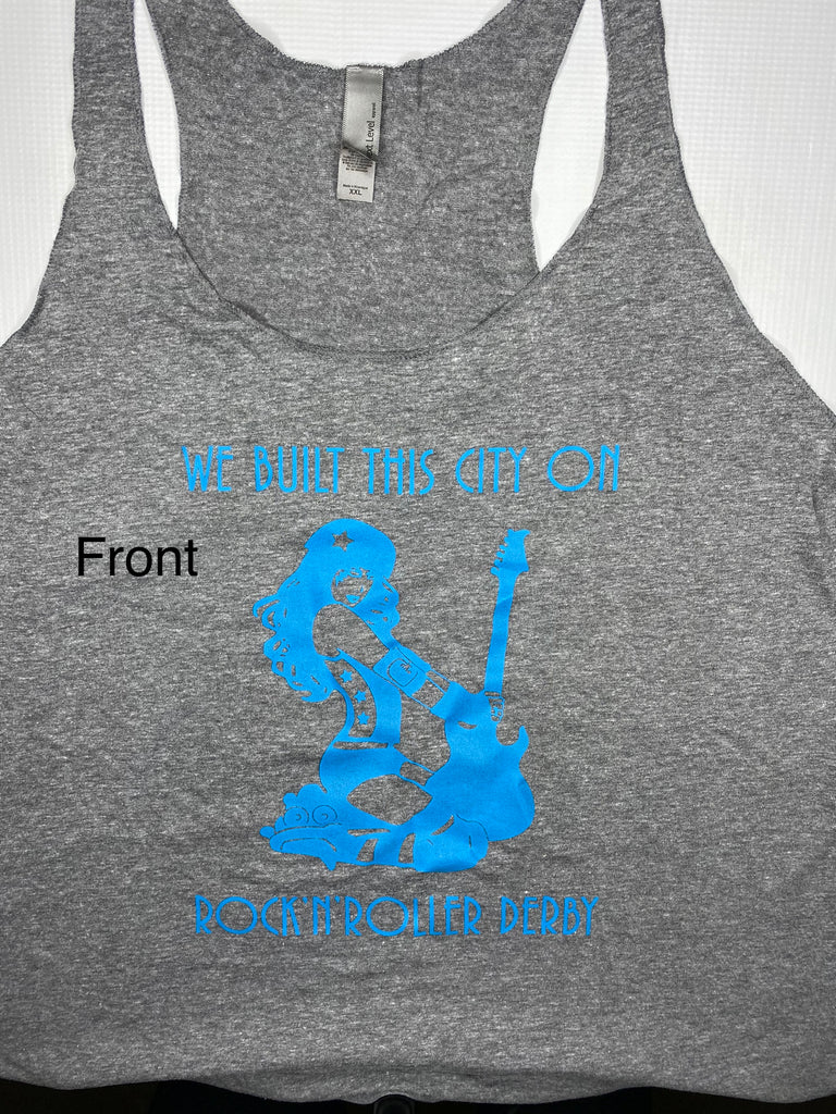 racer back tank top with inverted Rockin’ city blue logo. GreY